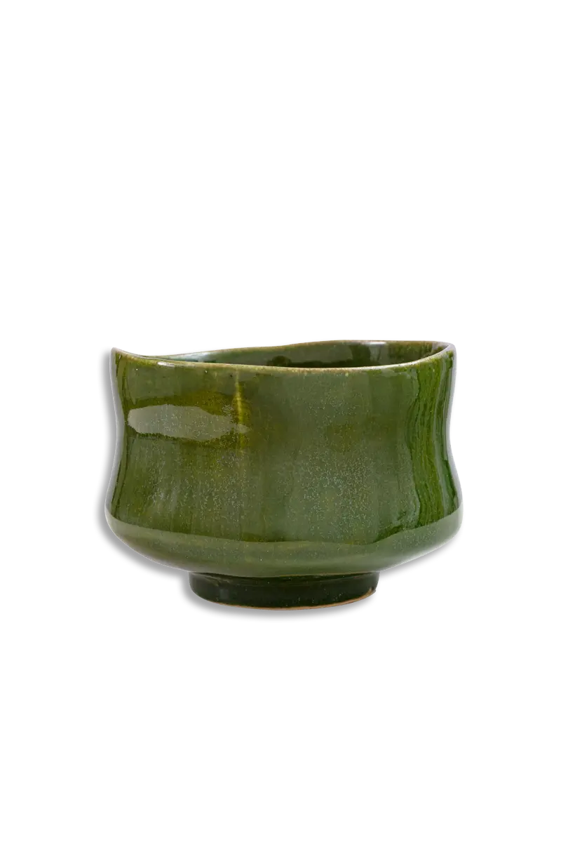 Matchawan Kioto vekker oppmerksomhet med sin dype, livlige grønne glasur som fremkaller fargene på tefelt og roen i japanske hager. Den subtilt uregelmessige formen gir den en organisk karakter, perfekt egnet til det meditative ritualet med å tilberede matcha.