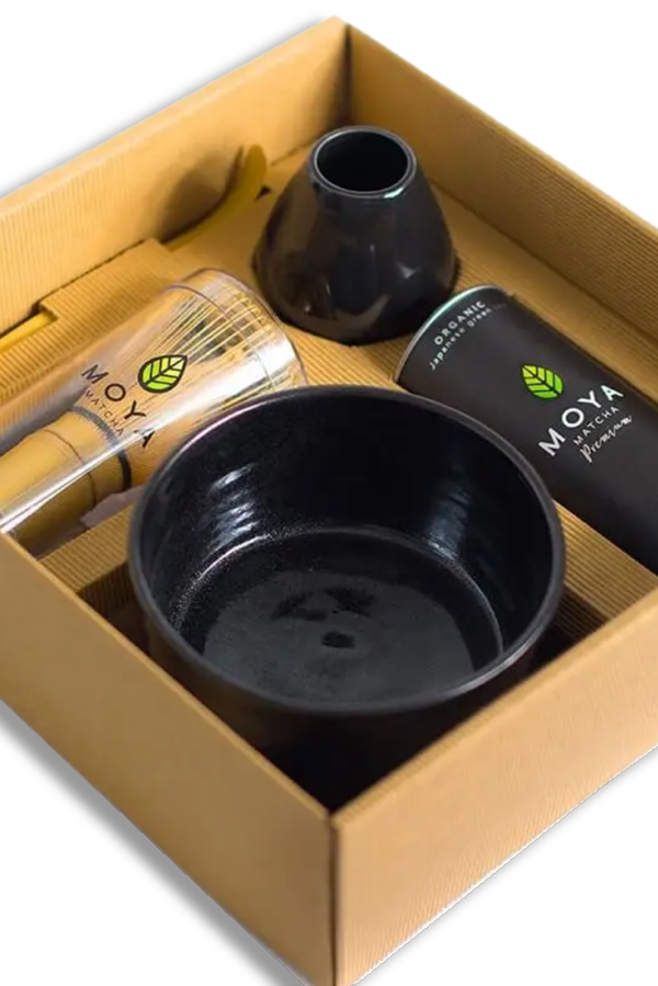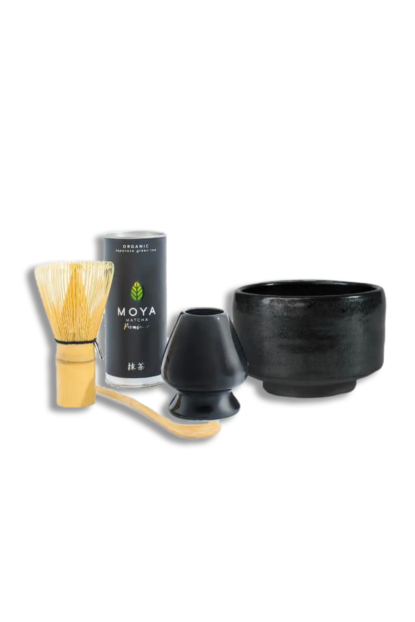 Moya Matcha Traditional (30g), den keramiske skålen Matchawan Yuro, en tradisjonell chasen-visp i bambus, en praktisk vispholder og en chashaku-skje i bambus.